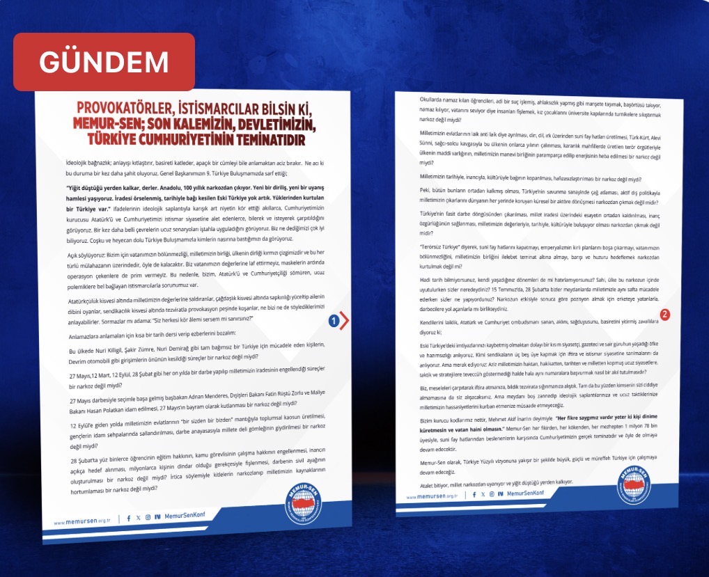 PROVOKATÖRLER, İSTİSMARCILAR BİLSİN Kİ, MEMUR-SEN; SON KALEMİZİN, DEVLETİMİZİN, TÜRKİYE CUMHURİYETİNİN TEMİNATIDIR.