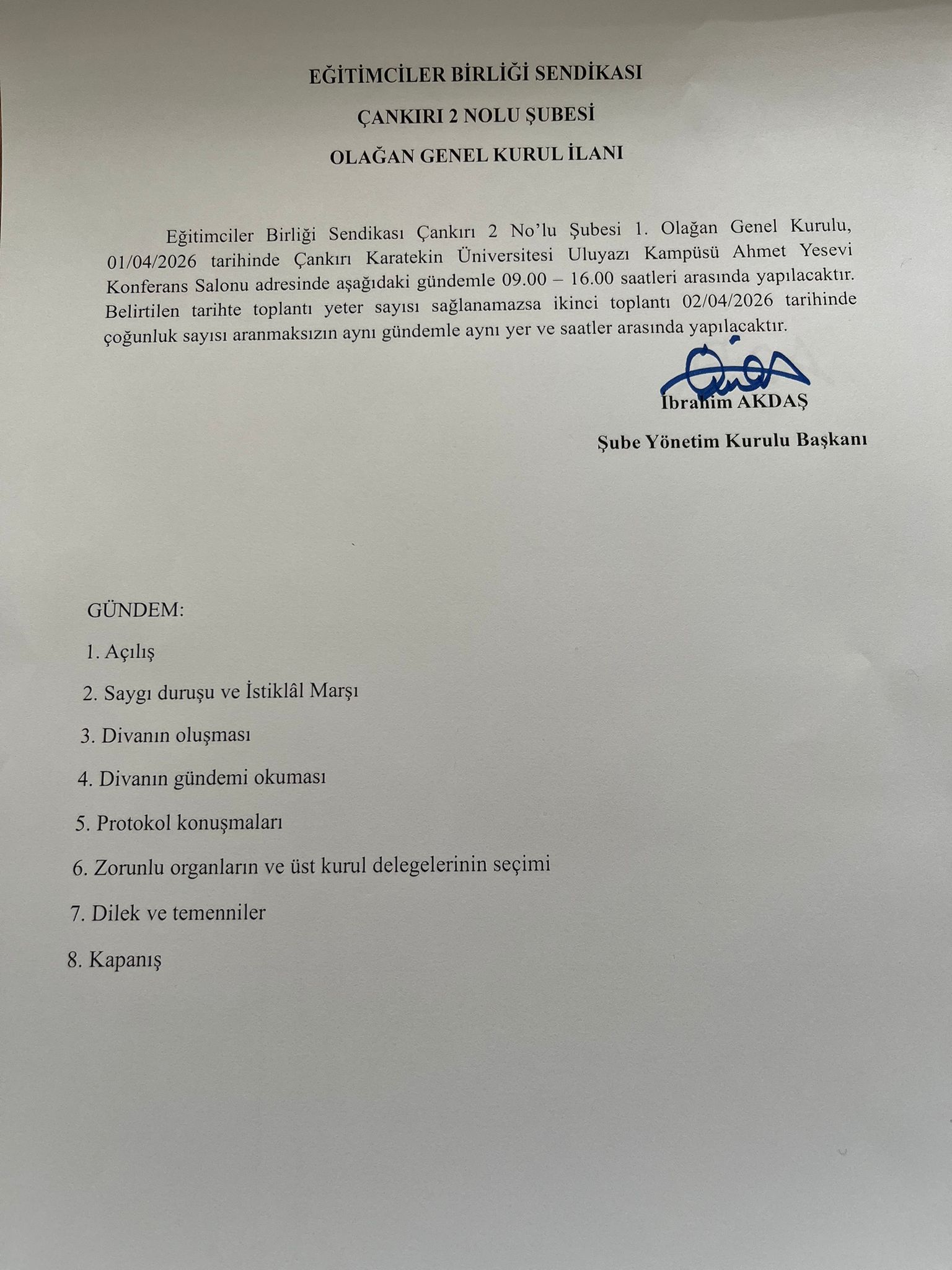 Eğitim-Bir-Sen Çankırı 2 Nolu Şube Olağan Genel Kurul İlanı Askıya Çıkarıldı.